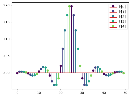 plt.stem(xi[i], h_poly[i], cm.viridis(i/M), label=f"h[{i}]")