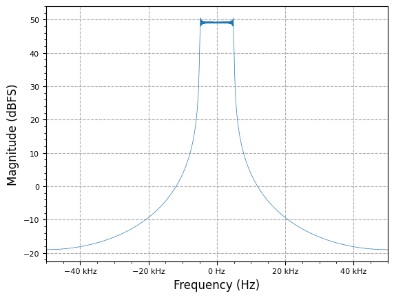 plot.spec_an(y_ds, fs/M, fft_shift=True, show_SFDR=False)